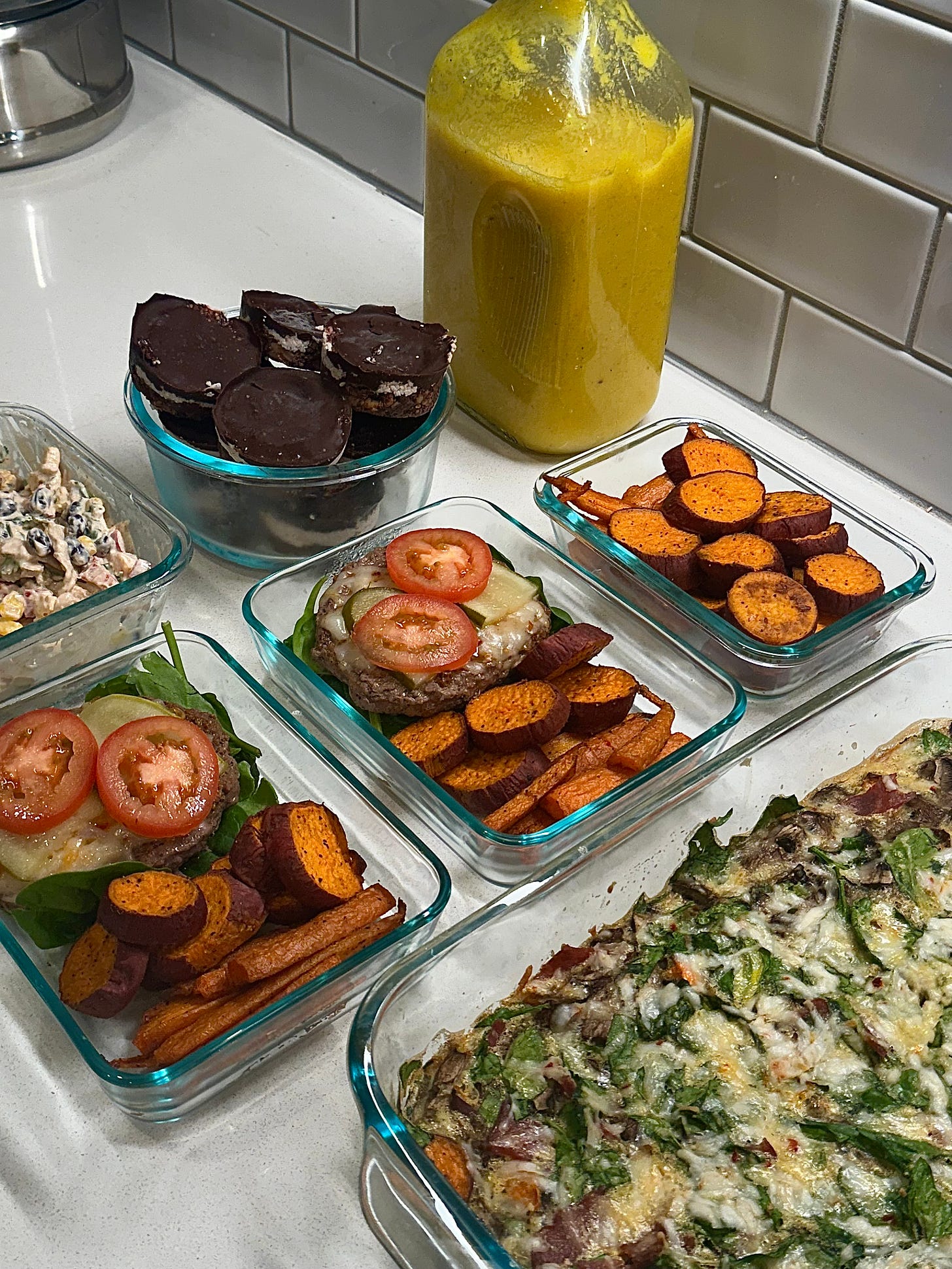 Veggie-Packed Egg Bake, Roasted Carrots & Yams, Burger Bowls with Secret Sauce, Southwest Chicken Salad (my fav from this pep), Luteal Phase Seed Cycling Cacao Cups, and my Anti-Inflammatory Elixir.